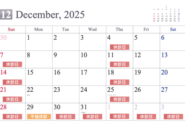 ■12月の休診日 ・すべての日曜日 ・すべての木曜日 ※12月29日(月)は午前診療いたします。 ※12月29... もっと読む »